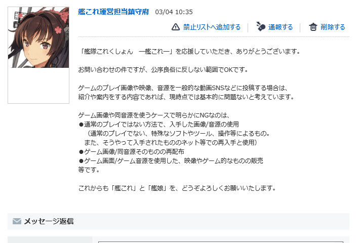 【艦これ】プレイ動画に関する質問の返信が運営から返ってきたんだけど これってどういうこと?