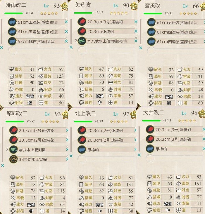 第二艦隊ですが摩耶様のポジションが安定せず、木曾を入れて雷撃を増やしたりしましたが最終的に摩耶様とBismarck dreiを気分で併用しました。摩耶かビスマルクに照明弾を持たせるように(電探を外しました)したら時雨と雪風のカットインが出る確立が上がりました。