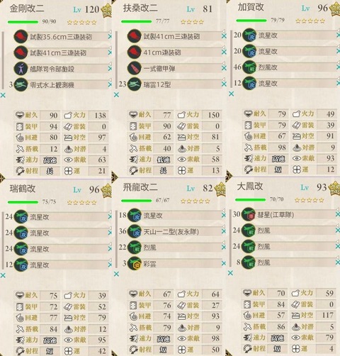 ボーキに余裕があったので航空機動部隊を選択。攻略開始時の編成はこんな感じです。途中、扶桑姉様が不調交代(大破や攻撃ミスが多い)で最終的には長門を入れました。装備は主砲x2と観測機と徹甲にしました。資源に余裕があれば大和型の方が良さそうですね。