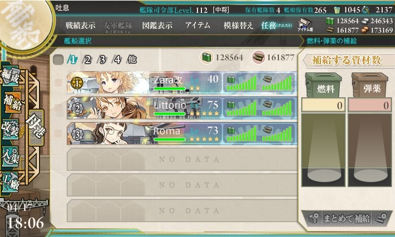 しかし諸般の事情で更新ができない(イタリア改造済艦が不在)だったため、ザラの練度を演習であげてイタリア水偵を回収できるようにしましたので、こちらもクチクチやっていこうかと。