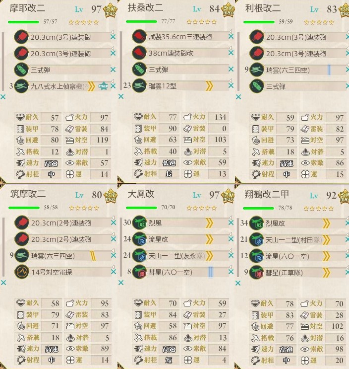 まずはゲージ削り編成から。翔鶴を装甲空母にしたので少し攻略の難易度が下がったかな?利根筑摩に瑞雲(六三四)を載せているので大鳳、翔鶴は1スロットに烈風入れるだけで航空優勢が取れました。制空権計算機を使うと良いです。