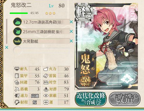 鬼怒改二は大発の運営が可能になったようです。改二のLVですがかなり高い練度が必要と書いてありかなり不安でしたがLV80は改造可能でした。良かった・・・。あとは予想通りというか設計図も必要です。 むっちゃイケメンになってる! 初期装備は25mm三連装機銃 集中配備もあり対空カットインも可能になったのかな?